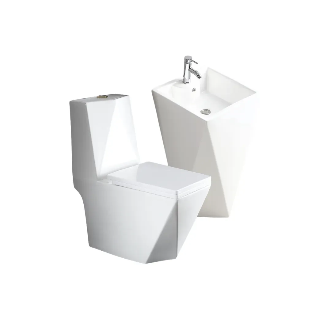 CMB0073 COMBO INODORO SAYBE PRISMA BLANCO + DOMUM LAVAMANOS PEDESTAL PRISMA + GRIFERIA PISA GUM METAL BAJA (GPL1020+GPL1022+GPL0988)