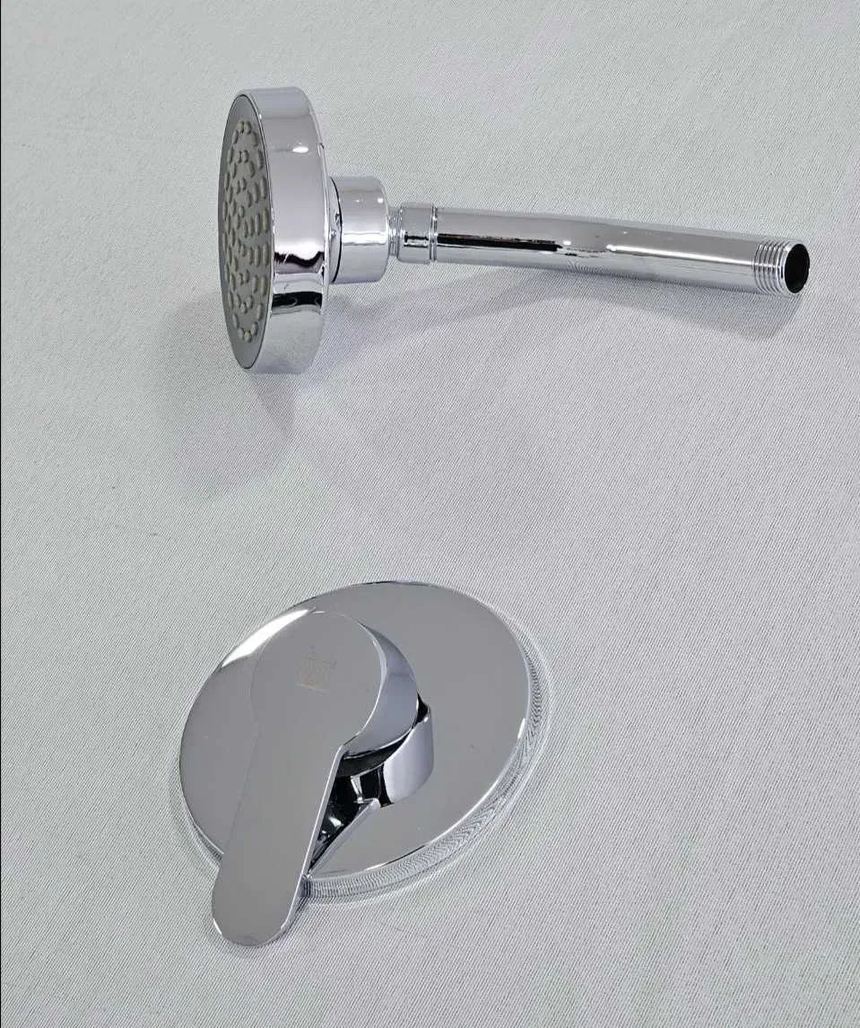 Cabezal de ducha redondo de 10cm, con brazo de ducha de 12cm de largo.