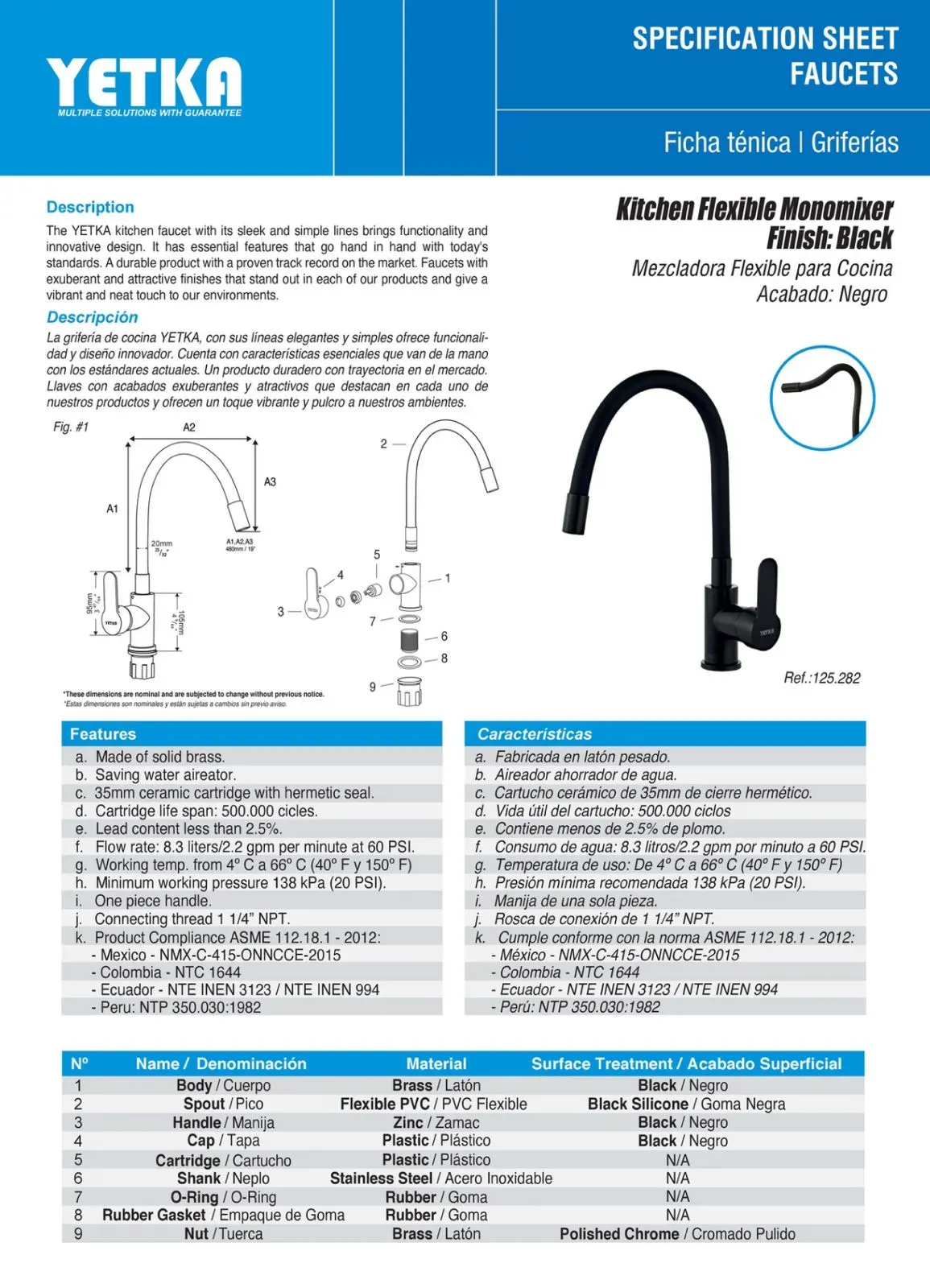 GPL0548 YETKA GRIFERIA COCINA MEZCL MESA FLEXIBLE - CUELLO NEGRO